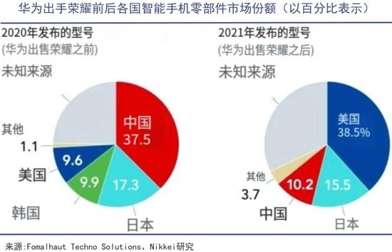 日经新闻曾披露,经由调查公司深入拆解,美国公司所制造的零部件在荣耀X30中的占比,相较于单飞前的华为荣耀30S,已从原先的9.6%显著提升至38.5%。