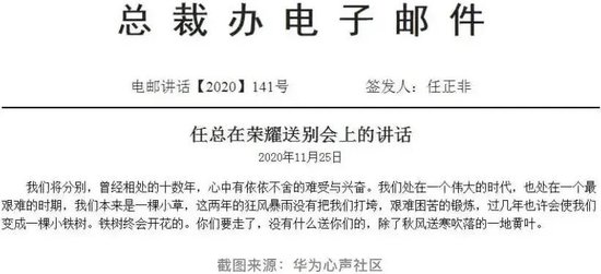 2020年,任正非在荣耀送别会上讲道: