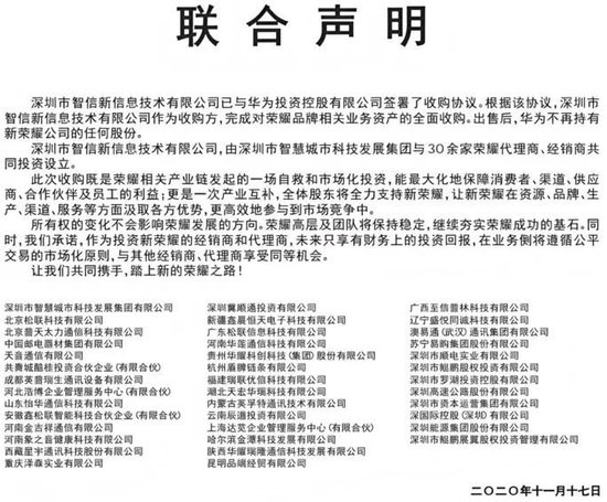 华为被迫“断臂求生”,以2600亿元(财新报道)的估值将荣耀剥离,接手方为深圳市智信新信息技术有限公司,后者由深圳智慧城市发展集团和30多家代理商、经销商共同成立,其中不乏天音通信、苏宁易购等全国连锁商,以及北京松联、山东怡华等区域连锁店。