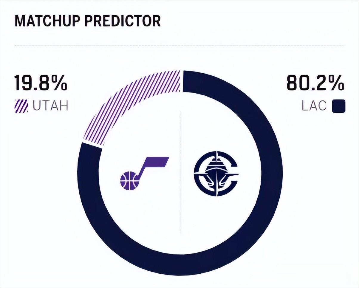 赛前,美媒ESPN对本场比赛进行了胜率预测,爵士队胜率仅有19.8% ,快船队胜率则高达80.2%,这差距本赛季此前还从来没有过。